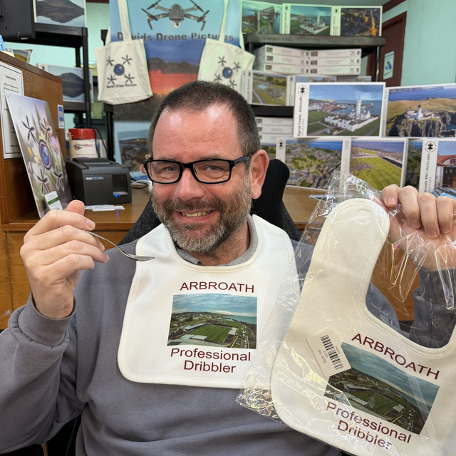 Baby's Bib with a picture of Gayfield Park with the word "Arbroath" above and "Professional Dribbler" below. I can only apologise that no babies were available to model.